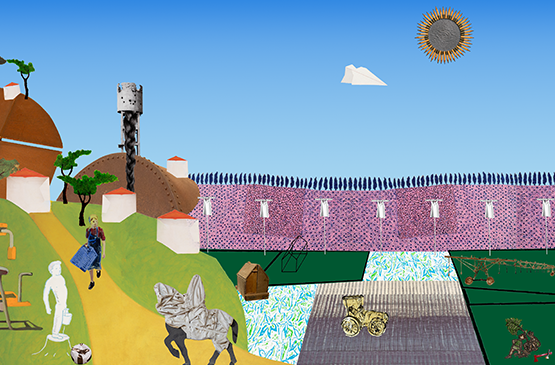 דימוי: גבריאלה וילנץ, יום חול בקיבוץ, טריפטיך 2026, קולאז' דיגיטלי ואנימציה (פרט)