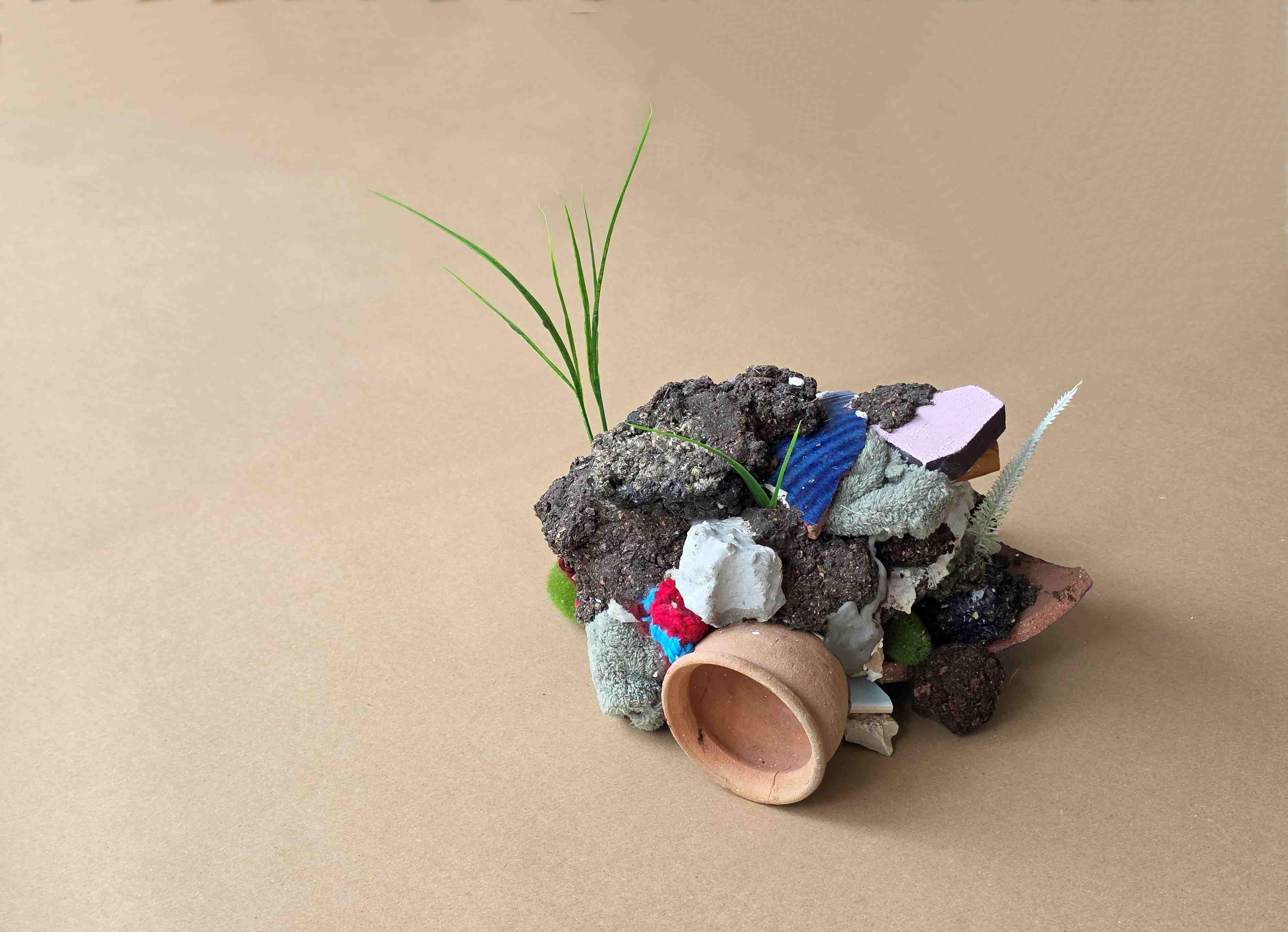 דימוי עליון: תמר שפר, בנה ביתך, 2026, טכניקה מעורבת (פרט מתוך מיצב), באדיבות האמנית